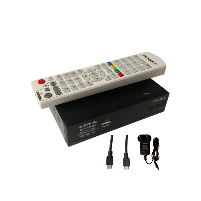 SOLID HDT2+S2-6600 FreeToAir Satellite, Terrestrial, and Internet Video Streaming IT-Box comes with a remote, HDMI, and power adapter