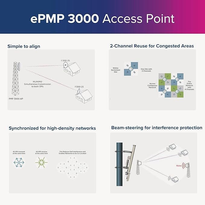 - HIGH SCALABILITY: The ePMP 3000 serves up to 120 subscribers per sector and with TDD and GPS Synchronization which minimizes self-interference in high-density networks. All of the ePMP 3000 Dual Horn MU-MIMO Antennas have a predictable performance, as they are integrated into Cambium Networks LINKPlanner with a precise 3D model showing gain across all elevations and across the azimuth.