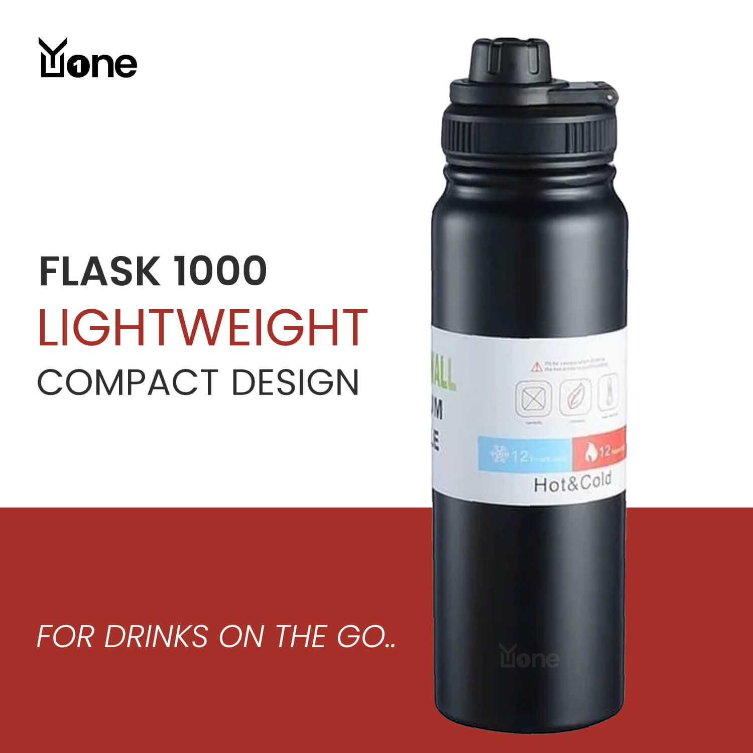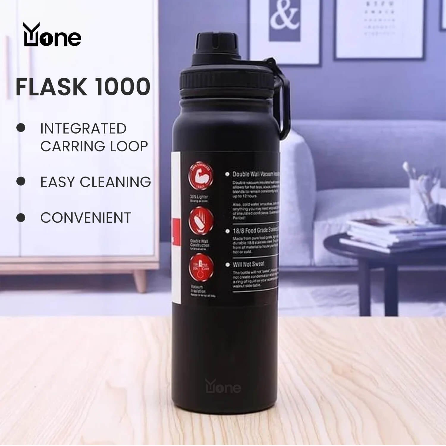 The YuOne Flask 1000 is a sleek, lightweight, and compact stainless steel bottle with a 900ml capacity. Made from high-quality 304-grade stainless steel, it features double-walled vacuum insulation that keeps beverages hot or cold for up to 15 hours. The flask includes an integrated carrying loop in the lid, which can be easily opened or closed, and a large branding space for customization. It’s BPA-free,