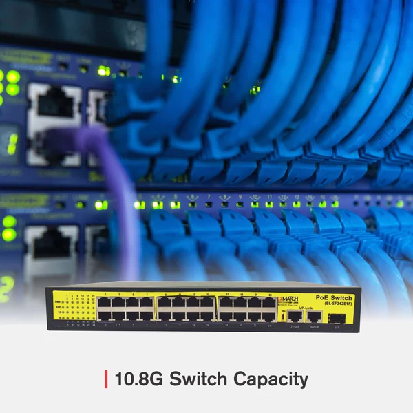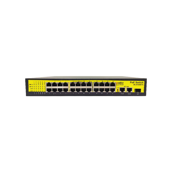 Get this 24 Port PoE switch and reduce the cost of multiple switches. This PoE provides 24 ports with 10/100Mbps speed. Get 2 Giga uplink ports with 10/100/1000Mbps speed and 1 Fibre Port. Get easy set up and installation.