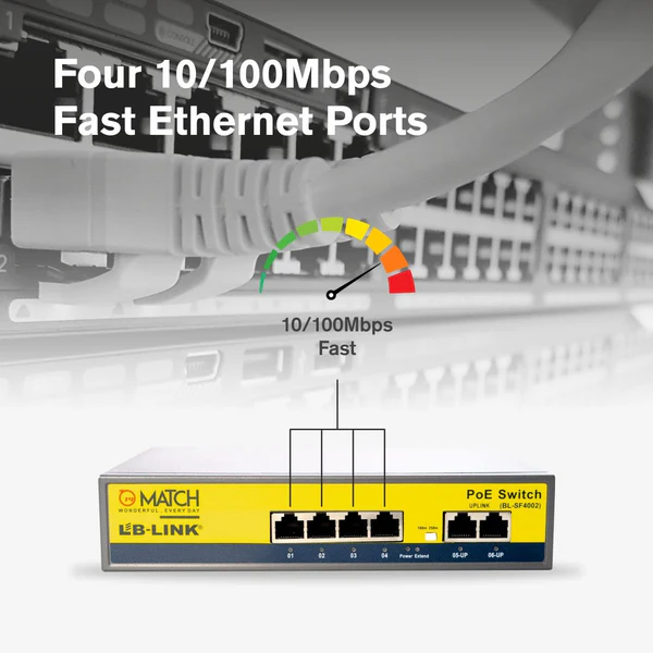 This Match LB-Link 4 Port PoE switch has 2 Uplink ports which provides 10/100Mbps speed. You can easily connect to other higher-speed devices in the network.