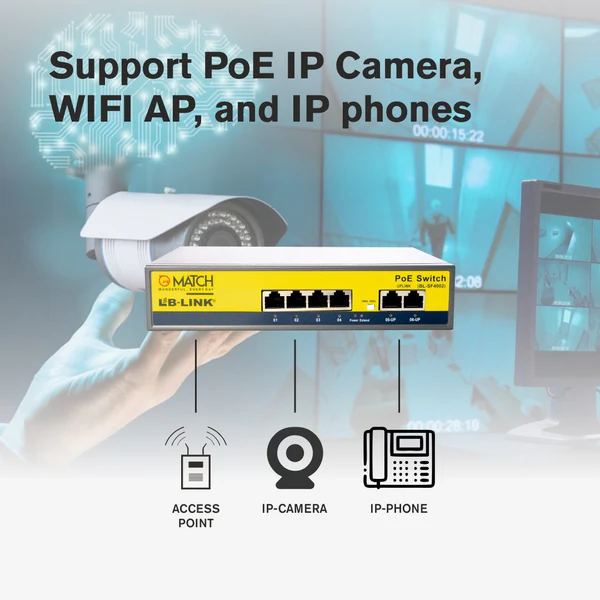 This Match LB-Link PoE switch supports PoE IP cameras, PoE WIFI AP, and PoE IP phones. You can use this switch for multi-purpose. It also supports CAT-5e for better access point (AP) and data transmission for the networking camera.