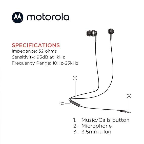 Motorola Wired Earbuds with Microphone – Earbuds 105 Corded in-Ear Headphones, Control Button for Calls/Music, Comfortable Lightweight Easy-Grip Ear Buds, Clear Bass Sound, Noise Isolation