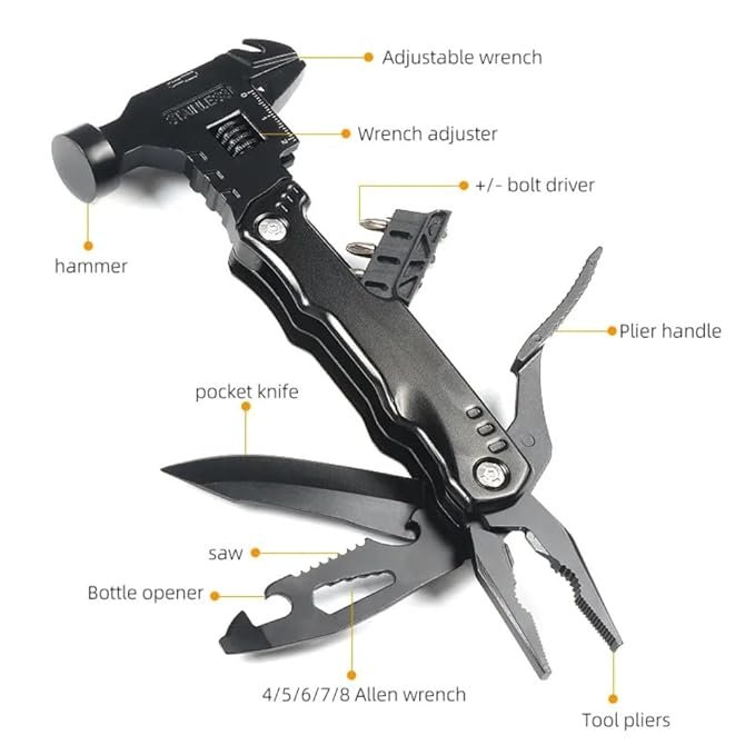 Steel & Practical Multitool – 16 in 1 Steel hammer multi tool including heavy duty mini hammer, safety belt cutter, screwdriver hole, allen wrench,Adjustable wrench, nail puller, slotted screwdriver, knife,bottle opener, screwdriver (PH1/PH2), slotted screwdriver, bottle opener, serrated knife, regular pliers, needle nose pliers.Great working in Home improvement, Carpentry and DIY projects,etc.