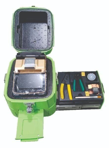 Compact Design, Small and Lightweight – 122 (W)×130 (L)×148 (H)mm, min. 2.08kg with battery. This fusion splicer is water-resistant, dust-resistant, shock-resistant. The carry case can be used as working bench. Complete accessories such as spare electrodes and fiber cleaver are included in this fusion splicer kit.