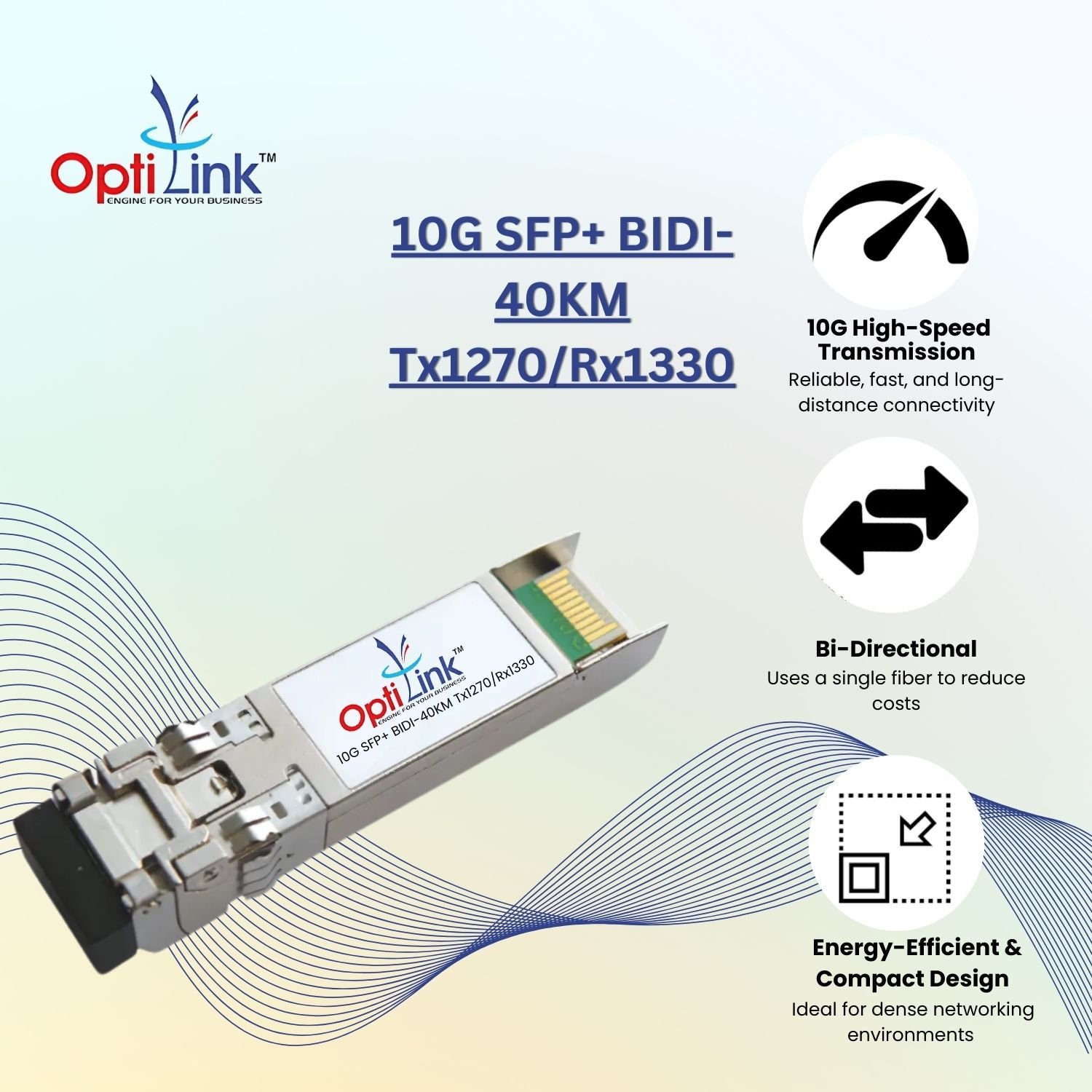 The 10G SFP+ BIDI-40KM (Tx1270/Rx1330) – OptiLink is a high-performance bi-directional optical transceiver designed for 10Gbps data transmission over a single fiber. It supports long-distance connectivity up to 40KM, making it ideal for telecom networks, data centers, and enterprise solutions. Operating at Tx1270nm / Rx1330nm, this module ensures low power consumption, high-speed performance, and stable data transmission. Fully compliant with IEEE 802.3ae and SFP+ MSA standards, it guarantees seamless network expansion and cost-efficient fiber utilization. With hot-swappable capability, it allows quick deployment and maintenance, ensuring reliable performance in demanding networking environments.