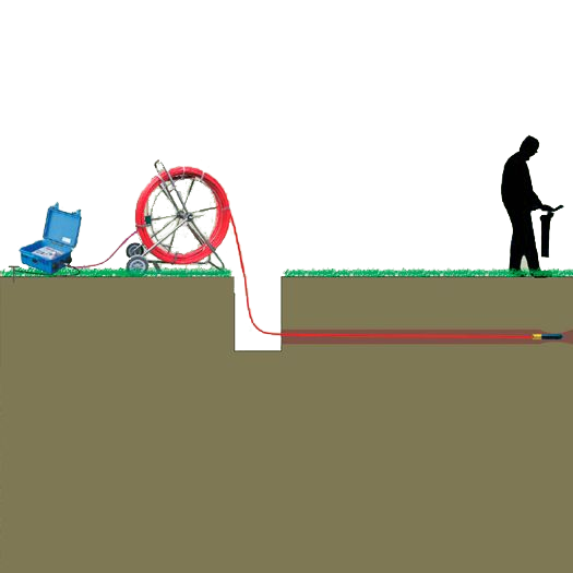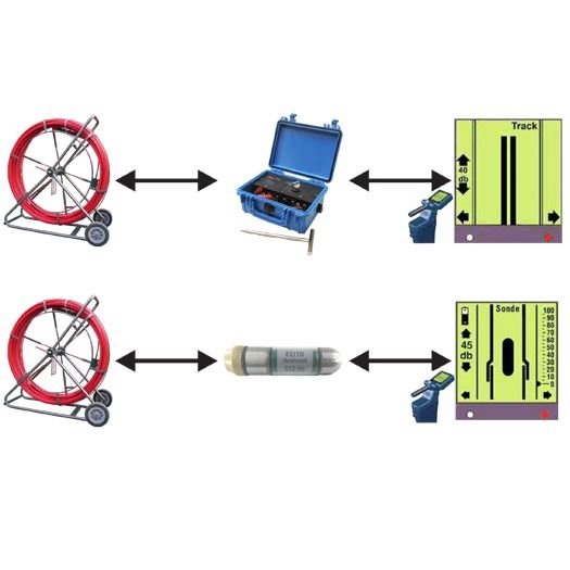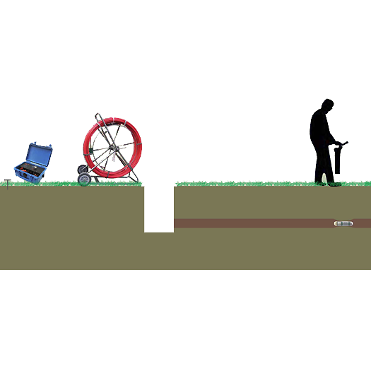 The SONDE operating at 512Hz is attached to the CTRAK Traceable Duct rodder unit & is pushed inside the non-metallic HDPE Conduit or any other line until it stops due to blockage in HDPE pipe or because of entry into the next manhole. The CTRAK contains a 1 sq. mm tracer which is energized by the Line exciter at 8/16/32 or 64 kHz. The digital receiver is then set to receive frequencies at 8/16/32 or 64 kHz to trace direction and route of line in the Line Tracing Mode. Once the trace is completed until the line trace starts to fade, the receiver setting is changed to the Sonde Tracing Mode to receive 512Hz frequency transmitted by the SONDE or any other customized frequency which can then be used to pin point exact point of blockage in HDPE conduit or manhole location.