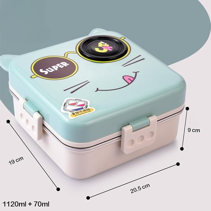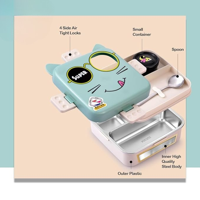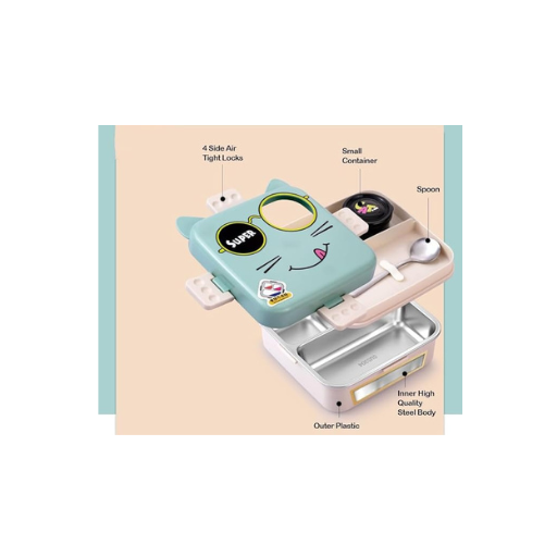 Super Cat Kids Lunch Box 2 Layer Stainless Steel Lunch Box Comes with 1 Detachable Tray, 1 Small Container & 1 Spoon Ideal for Kids BPA Free 1100 ml