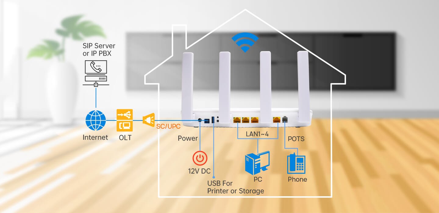 UBIQCOM Dual-Band XPON WiFi 6 ONT – AX1500 FTTH Router with 4 GE, 1 POTS, USB 3.0, and External Antennas