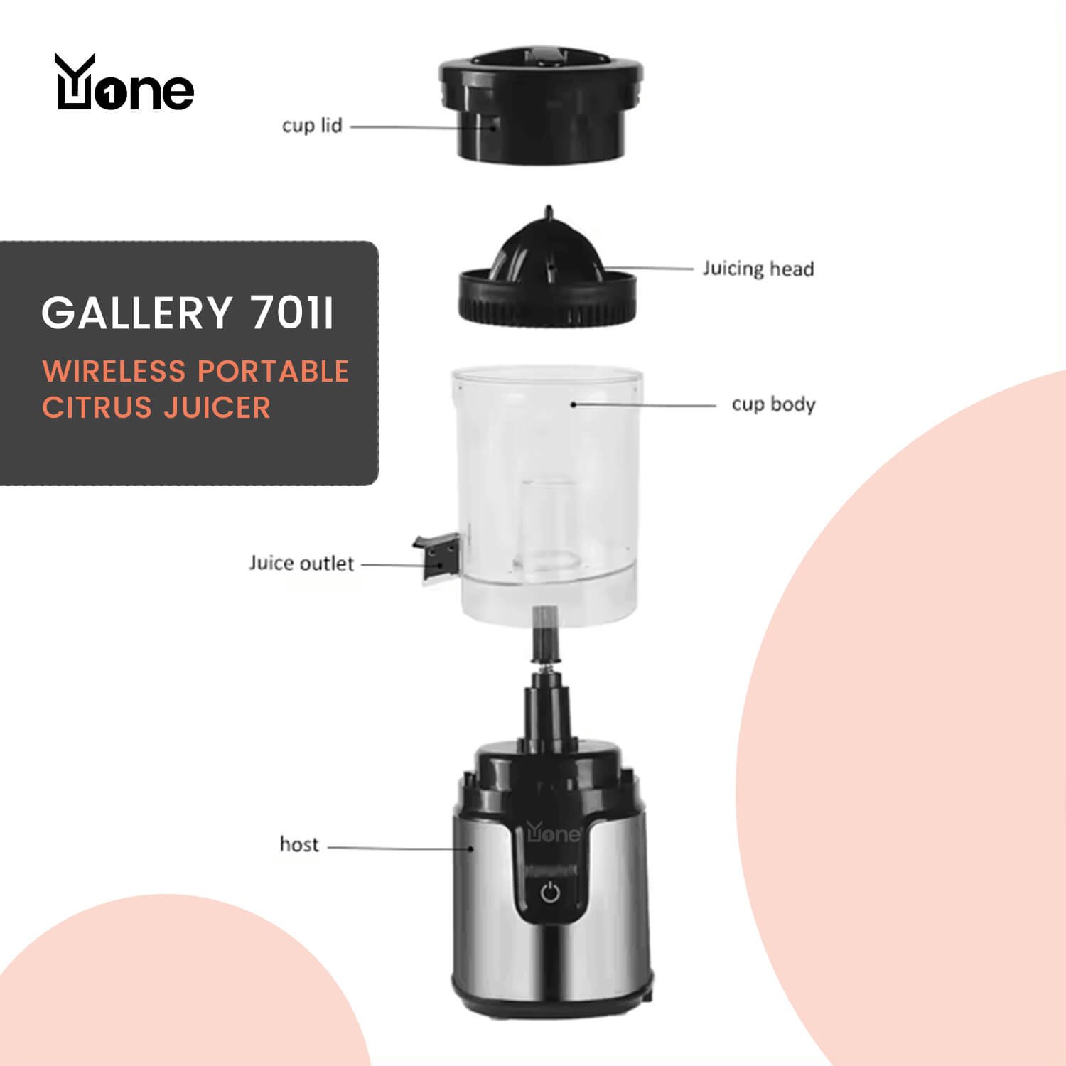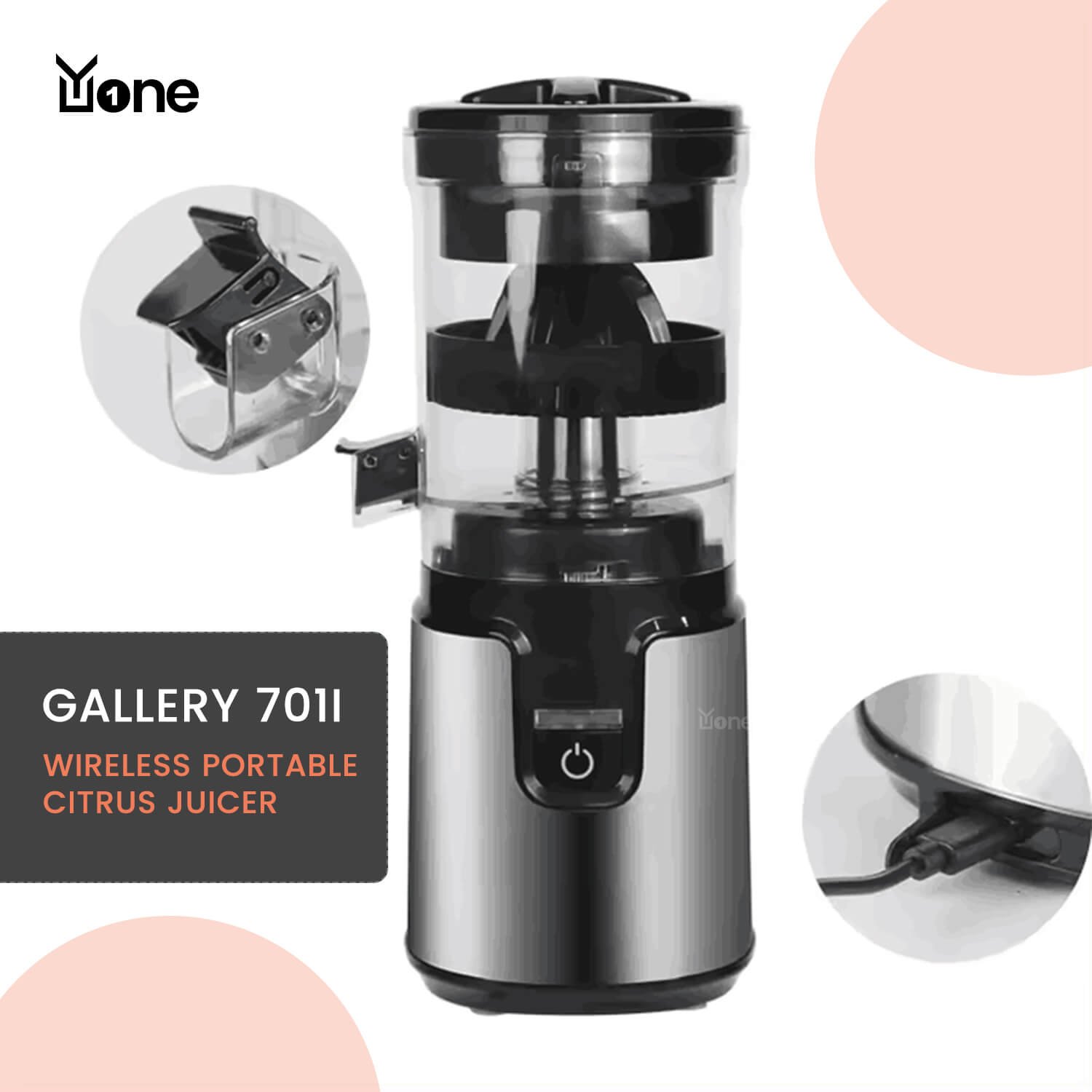 The Yuone Gallery 701i USB Wireless Portable Citrus Juicer is a compact, quiet juicer perfect for home or on-the-go use. Featuring a masticating, low-noiseDC motor, it efficiently extracts juice with minimal disruption. With a 300ml capacity and lightweight plastic design, this multifunctional juicer is easy to carry and clean. Operating at 7.4V and 60W, it’s ideal for quick, healthy juices anytime, anywhere.